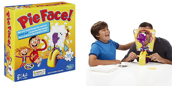 «Пирог в лицо», Игры Hasbro. Эту игру оценят как большие, так и маленькие любители юмора и розыгрышей. «Пирог в лицо» представляет собой конструкцию в виде специальной маски, в которую игроки просовывают лицо, игрушечной метающей руки-катапульты для пирога, а также рукоятки, которая приводит механизм в действие. Правила игры довольно просты: участники вращают рукоятку, которая приводит в действие руку-катапульту с пирогом, и в самый неожиданный момент кто-то из игроков получает сладкое лакомство в лицо, и вместе с ним – массу положительных эмоций и смеха! Игра «Пирог в лицо» абсолютно безопасна и подходит для детей от 5 лет и старше, но детям рекомендуется использовать ее только в присутствии взрослого. Сливки в комплект не входят.